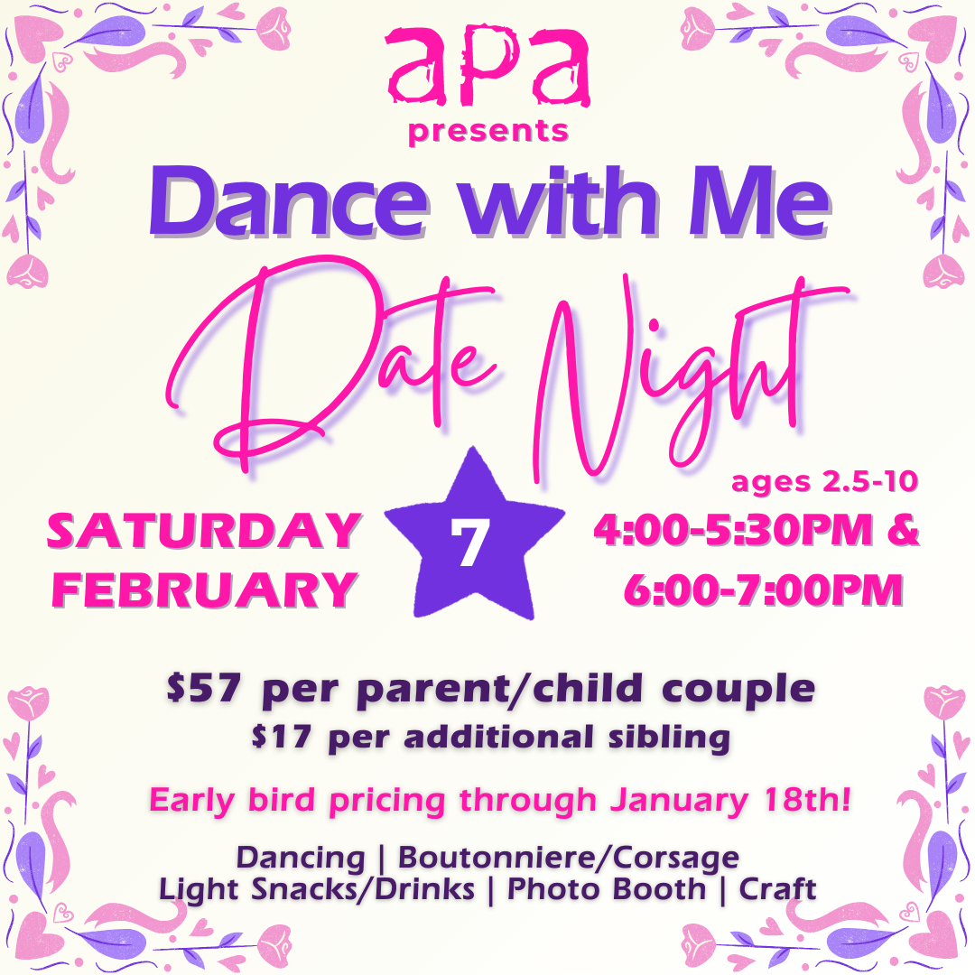 ✨ Get Ready for an Unforgettable Valentine’s Celebration! ✨ Join us for APA’s second annual Dance with Me Date Night, a magical evening designed for parents and kids (or aunts, uncles, and grandparents!) to make memories that last a lifetime. This fun-filled event features dancing, delicious snacks and drinks, a creative craft station, a photo booth to capture your special moments, and even a boutonniere and corsage to add an extra touch of elegance. Choose the time that works best for your family and enjoy a night of dancing, laughter, and tons of FUN. Don’t wait—grab your tickets now! Let’s make this Valentine’s Day one to remember!