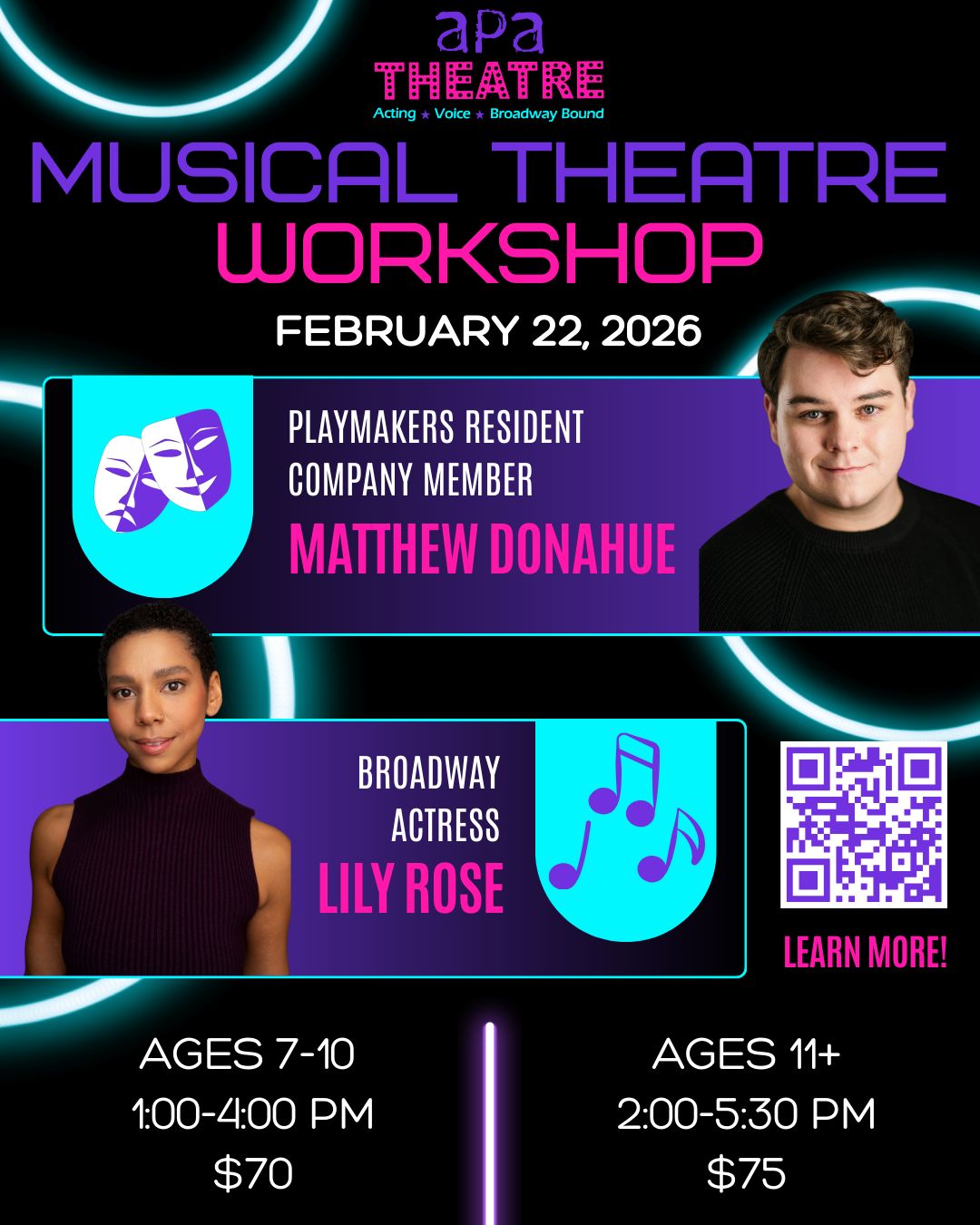 Join us for APA’s annual in-house Musical Theatre Workshop! This year, students have the opportunity to work with local actor and resident company member of the Playmakers Reparatory Company as well as Broadway actress Lily Rose (Bad Cinderella, Little Mermaid at Papermill Playhouse, and more).